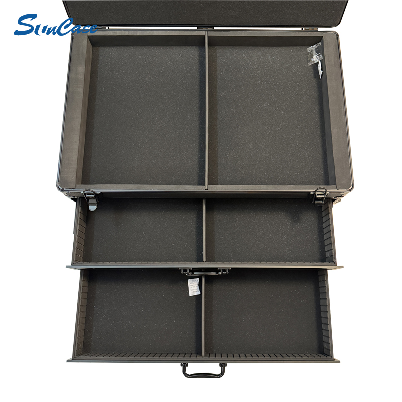- Composition and Structure: The Customized Aluminum Trolley Case Made with 1 Trolley Rod and 2 Wheels, The top section made with dividers, Two drawers with dividers, Two handle made on the two sides, with Black EVA foam lining.
